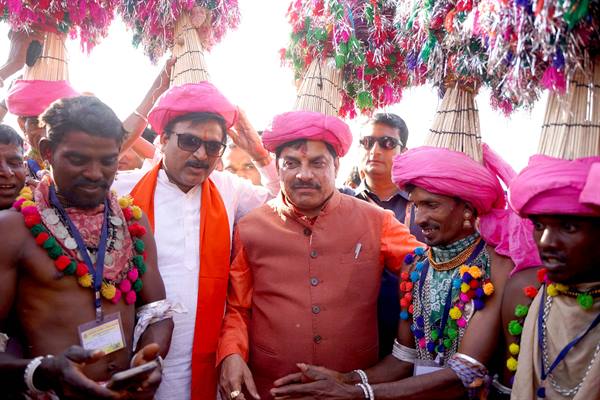 मुख्यमंत्री का तीर कमान एवं कुलदेवी की टोकरी भेंट कर किया स्वागत