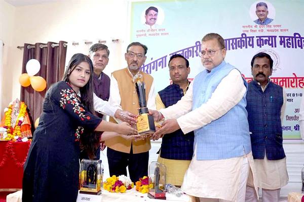 ऊर्जा मंत्री श्री तोमर द्वारा महाविद्यालय की विभिन्न गतिविधियों में विजेता रहीं छात्राओं प्रिया नरवरिया, वर्षा पाल, हर्षिता शर्मा, स्नेहा यादव, सुमन, दीप्ति श्रीवास तथा अंशिका को पुरुस्कृत कर उनके उज्जवल भविष्य की कामना की।